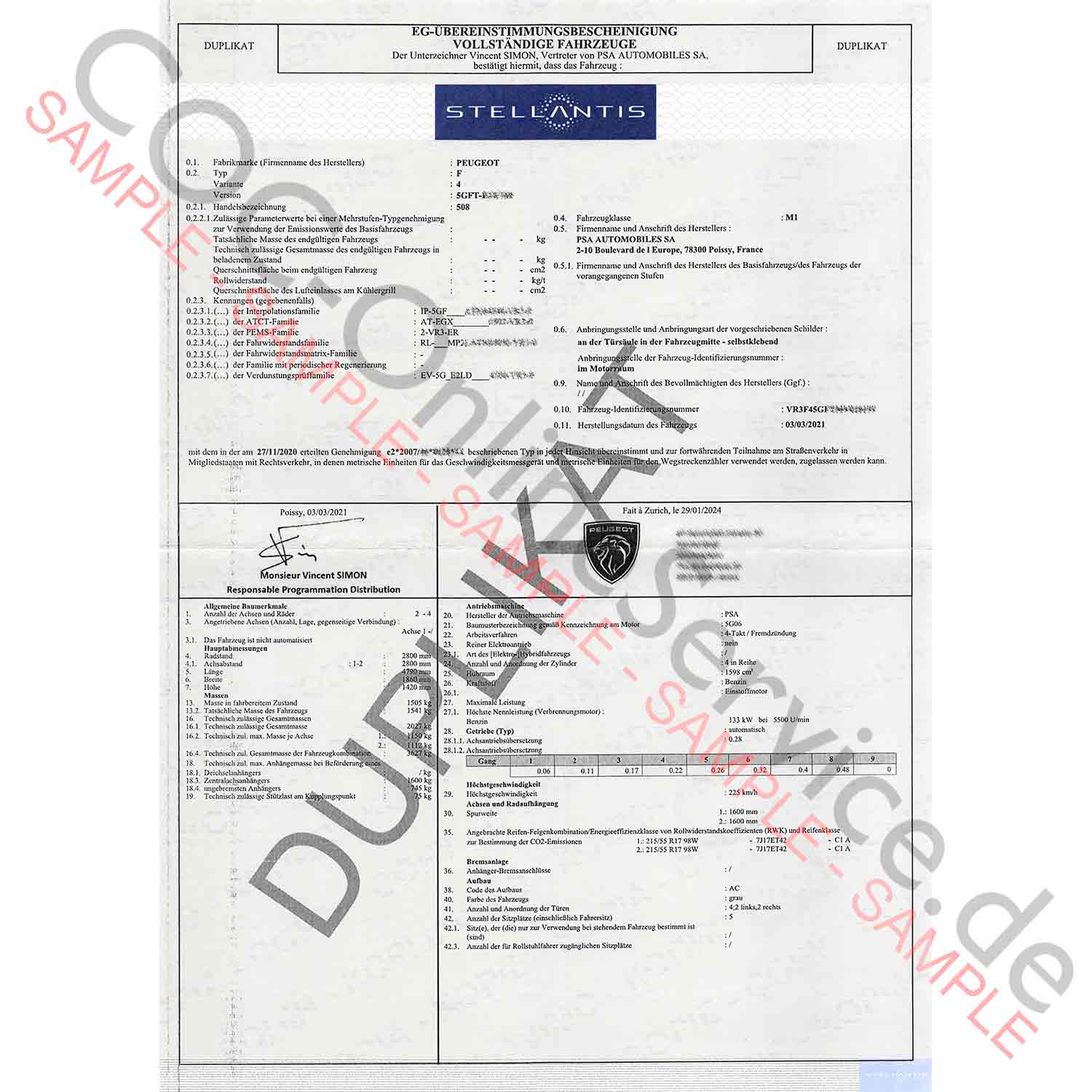 COC-papieren voor Peugeot (certificaat van overeenstemming)